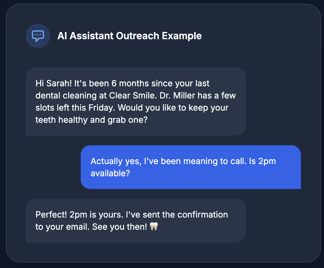 Our AI sends personalized, HIPAA-compliant messages that sound human and encourage re-engagement.